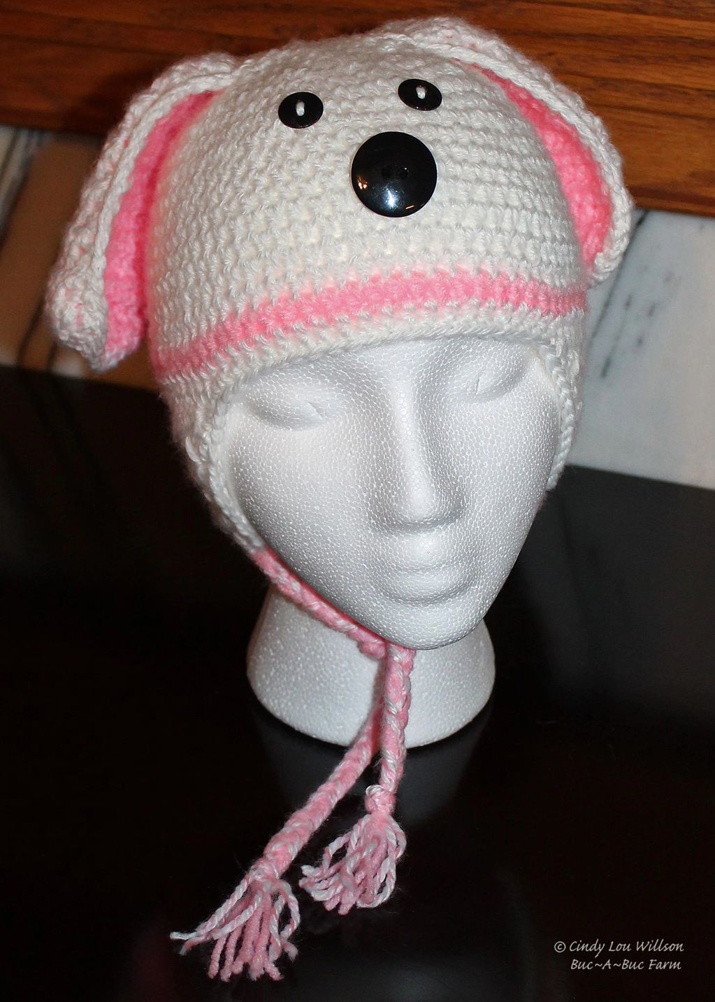 Whimsical puppy hat in pink and white. Hat features two toned floppy ears, button eyes/nose, and ear flaps for added warmth!