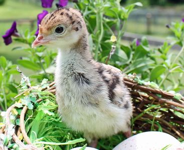 Like their wild turkey ancestors, they are coppery-bronze in color with a gorgeous metallic sheen. Babies are tan and darker brown with stripes down their head and back.